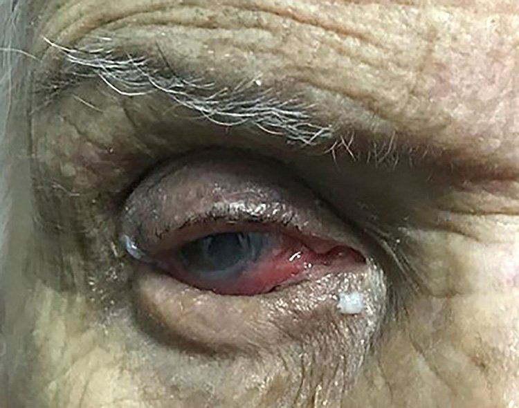 Ophthalmic herpes zoster was diagnosed. Medical treatment was: 800 mg of oral acyclovir five times a day, ganciclovir ointment five times a day, vitamin complex B1, B6 and B12 once a day, tobramycin drops every six hours. The clinical course throughout admission was torpid, ten days after starting treatment the slit lamp biomicroscopy showed: senile entropion in lower eyelid of right eye (caused by the forced closure of the eye due to the pain that the patient experienced), mixed hyperemia, chemosis, conjunctival de-epithelialization with pancorneal de-epithelialization with raised edges and stromal edema. The determination of the intraocular pressure and the ocular fundus study were not possible due to the patient’s condition (Figs. 2 and 3).