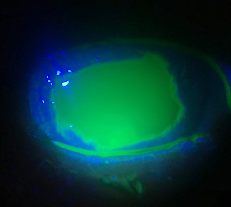 Given the diagnosis of severe ocular causticization by hydroquinone and glycolic acid, profuse irrigation with physiological saline was performed, with cleaning of necrotic tissue. The correct treatment was administered: 800 mg of oral acyclovir five times a day, ganciclovir ointment five times a day, vitamin complex B1, B6 and B12 once a day, tobramycin drops every six hours and exhaustive lubrication with dexpanthenol gel. The evolution of the corneal ulcer was torpid, and it was refractory to treatment. For this reason, it was decided to perform corneal covering with a double layer of amniotic membrane and a therapeutic corneal lens was placed to protect the membrane.