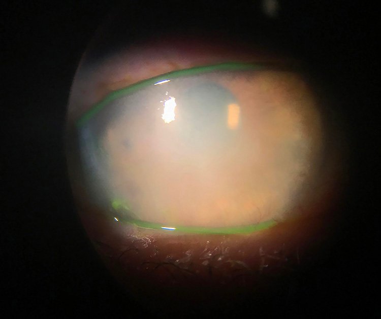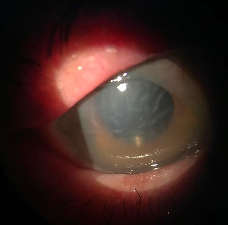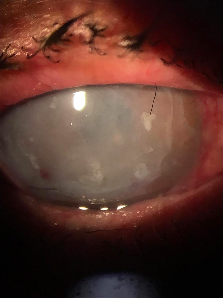 Figure 3. Mixed hyperemia, conjunctival de-epithelialization with pancorneal de-epithelialization with raised edges and stromal edema.