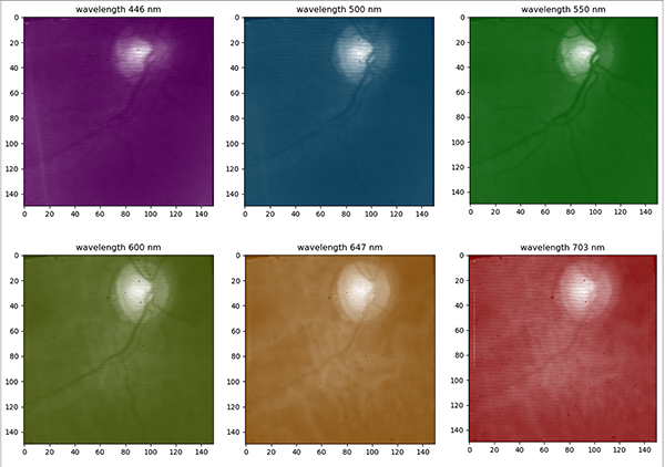 Figura 1. Secuencia de 6 imágenes de la papila óptica y un área adyacente con diferentes longitudes de onda, tomadas con una cámara hiperfractal de la empresa Mantis Photonics (imágenes cedidas por Mantis Photonics, Lund, Suecia).