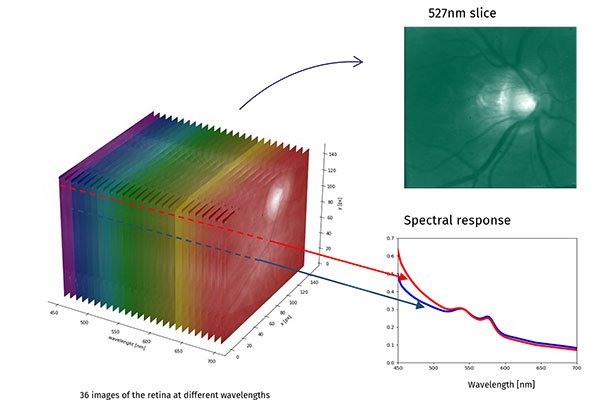The spectrum of information classically obtained from digital images of the retina is limited, since only monochromatic or trichromatic light (red, green, blue) reflected by retinal structures is recorded1. Hyperspectral imaging technology has the potential to overcome changes in retinal reflectance and light absorbance that occur during the development of various eye diseases, by producing an image that captures information from multiple wavelengths, generating a four-dimensional hyperspectral cube: two dimensions for orthogonal spatial data, a third for wavelength bands and finally, one for their corresponding absorbance/reflectance intensities at each wavelength1-2. Hyperspectral imaging collects data from tens to hundreds of narrow-wavelength bands, while multispectral imaging refers to data 3 to 10 bands wider1.