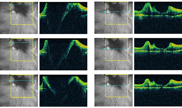 Figura 1. Secuencia de imágenes tomadas mediante tomografía de coherencia óptica donde se observa la desorganización estructural de la mácula.