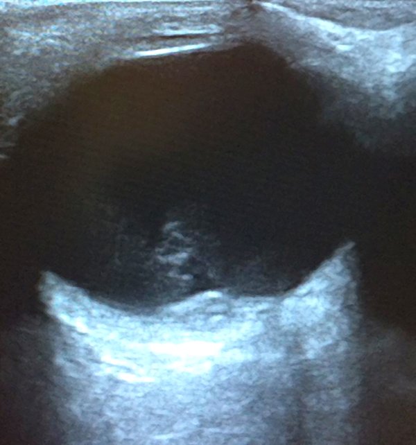 En la exploración se encontró una agudeza visual en OD de visión de cuenta dedos a 1 metro y en ojo izquierdo (OI) de 10 décimas. A la biomicroscopía no se detectaron particularidades en ambos ojos, sin presencia de reacción en cámara anterior. La presión intraocular era de 11 mmHg en AO. La paciente no pudo realizar el test de Amsler en su OD y en el OI era normal. Fondo de ojos: en el OD se observó una lesión macular con resto de retina aplicada sin hemovítreo ni lesión vascular periférica. El OI estaba normal. Se solicitó interconsulta a centro de mayor complejidad donde le realizaron una tomografía de coherencia óptica (OCT), una ecografía ocular modo B, que trajo la paciente a las 48 horas. En el OCT se observó la extensa afectación macular (fig. 1) también reflejada en la ecografía (fig. 2), interpretándose el cuadro de hemorragia prerretinal en área macular en contexto de maniobra de Valsalva. Se evaluó posibilidad quirúrgica con retinólogo, que viajó a examinar a la paciente a Río Grande, pero considerando riesgos/beneficios y en el contexto traumático de su reciente aborto, la paciente decidió no tratarse quirúrgicamente y mantuvo tratamiento tópico quedando con colirio de bromfenac 0,09% cada 6 horas durante 4 meses.