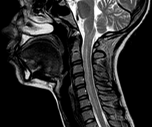 Figura 1. Resonancia magnética de columna cervical donde se observa una lesión hiperintensa en T2 longitudinalmente extensa (compatible con enfermedad desmielinizante).