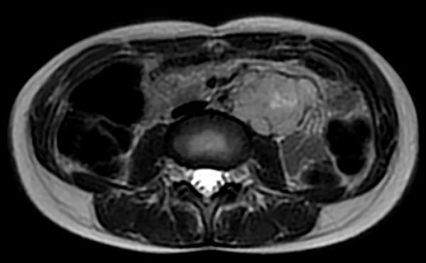 Figura 3. Imagen de resonancia magnética de abdomen con contraste. Se observa masa ocupante en zona del espacio paraaórtico.