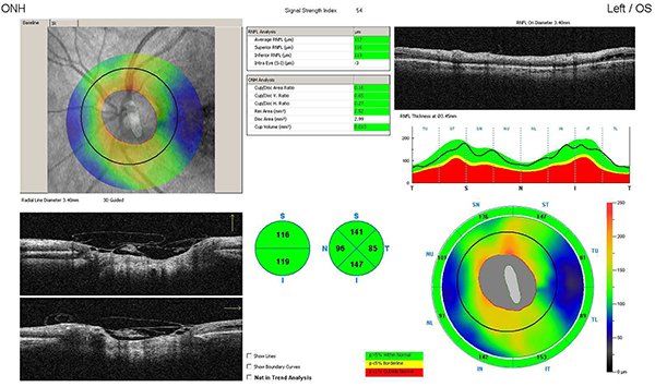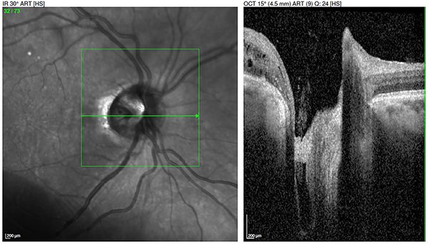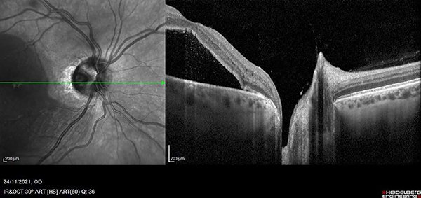 Figura 5. OCT de ojo derecho. En el nervio óptico, el espacio hiporreflectivo corresponde al pit de papila.