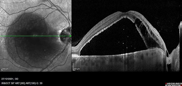 Figura 2. OCT de control de ojo derecho con persistencia del desprendimiento seroso y retinosquisis.