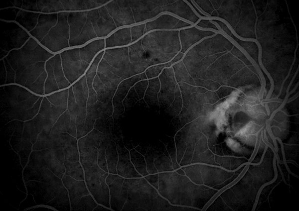 Figura 3. Angiografía fluoresceínica de ojo derecho en tiempo arteriovenoso tardío sin extravasación de contraste.