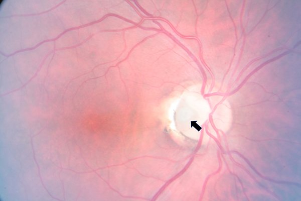 Figura 4. Retinografía color de polo posterior derecho con alteración a nivel del margen temporal del disco óptico (flecha: pit de papila).