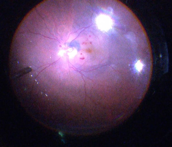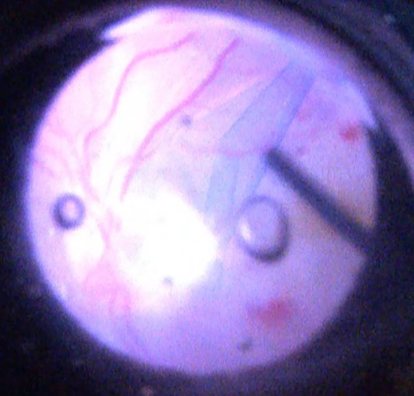 Figura 9. Retinografía color postoperatoria de disco óptico derecho donde se observa fotocoagulación láser peripapilar temporal.
