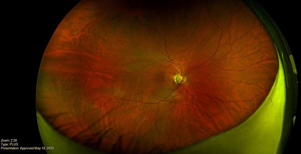 Figura 8. Retinografía color de campo ultra amplio postoperatoria de ojo derecho que muestra retina aplicada.