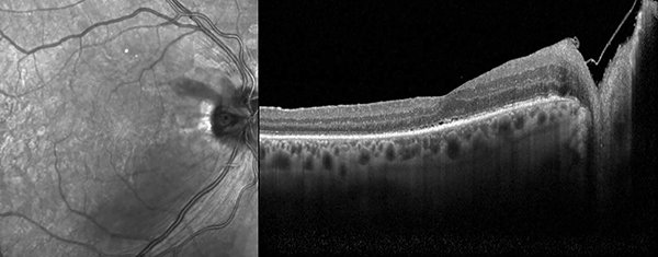 Al no presentar respuesta ante los tratamientos recibidos, reinterpretamos el cuadro clínico, observando detenidamente en el fondo de ojo derecho y en OCT una lesión compatible con foseta del disco óptico con filtración de líquido hacia el espacio subretinal (figs. 4 y 5).