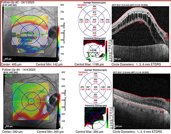 Figura 11. OCT comparativa postoperatoria de ojo derecho. Se observa disminución del fluido subretinal y retinosquisis luego de recidiva de ambos.