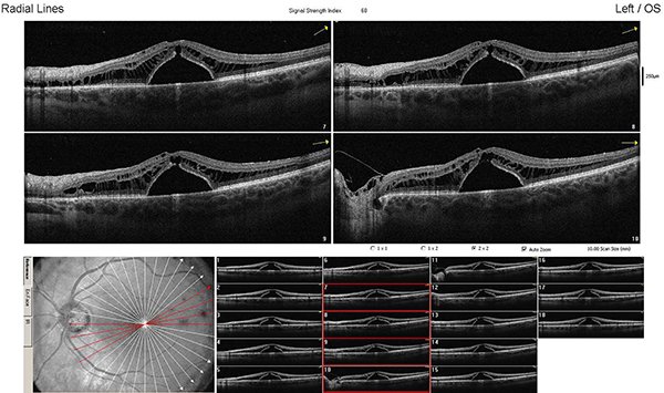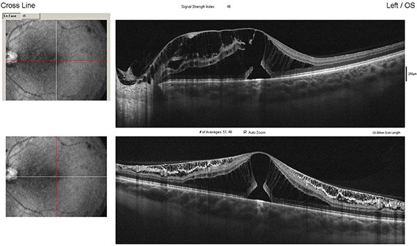 Figura 12. OCT de ojo izquierdo con desprendimiento seroso del neuroepitelio a nivel foveal y retinosquisis que afecta extensamente la mácula.