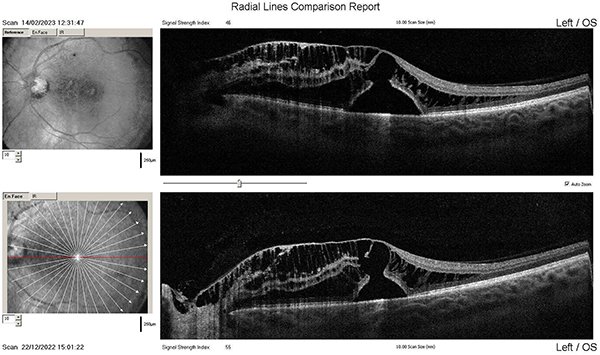 Figura 14. OCT postoperatoria de ojo izquierdo que muestra disminución del desprendimiento seroso y retinosquisis.