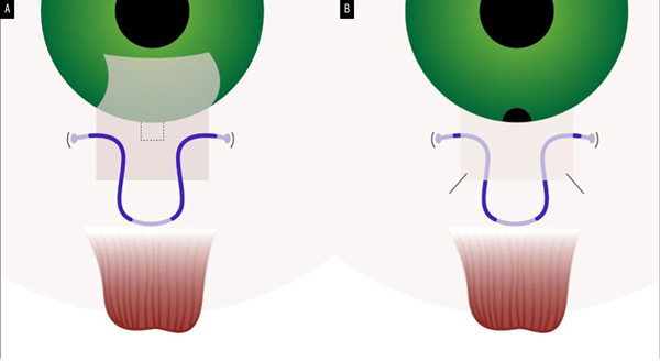 Figura 1. Esquema diseñado para mostrar la forma en la que se realiza la sutura (A) y cómo permanece (B) parte del trayecto de polipropileno dentro del colgajo o tapa escleral.