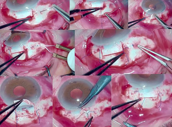 Figura 2. Parte de una cirugía de trabeculectomía modificada con polipropileno de la serie de casos presentada donde se observa cómo se pasa la sutura de polipropileno 6.0 en forma de letra omega, cauterizando los extremos para dejarlos insertados en los bolsillos esclerales, para finalmente cerrar la tapa escleral donde parte del trayecto de polipropileno dentro del colgajo o tapa escleral.