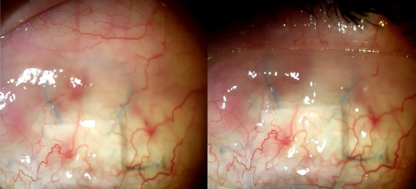 Figura 3. Aspecto del postoperatorio a los 7 días de una cirugía de trabeculectomía modificada con polipropileno donde se muestra que al realizar una maniobra de ligera compresión palpebral se verifica el correcto funcionamiento de la ampolla.