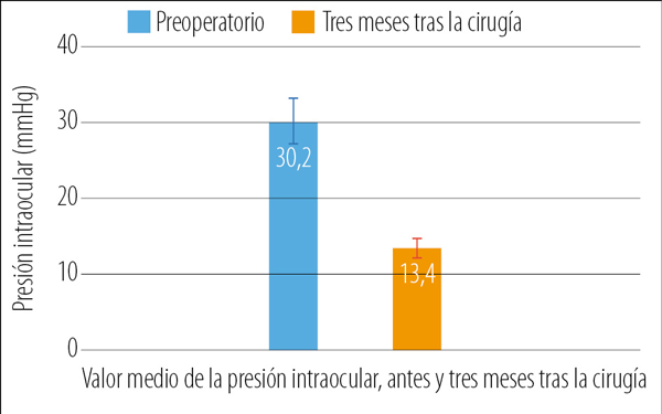 Figura 4. Valor medio de la presión intraocular antes y tres meses tras la trabeculectomía modificada, asistida mediante polipropileno.