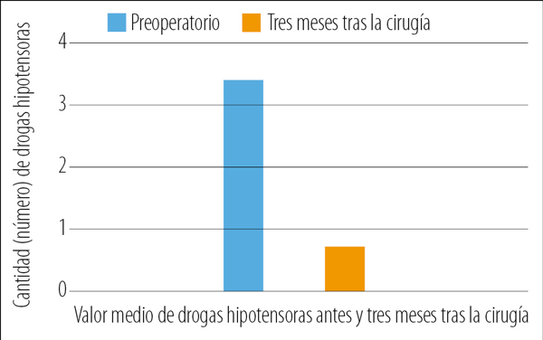 Figura 5. Cantidad de drogas utilizadas antes y a los tres meses de la trabeculectomía asistida por polipropileno.