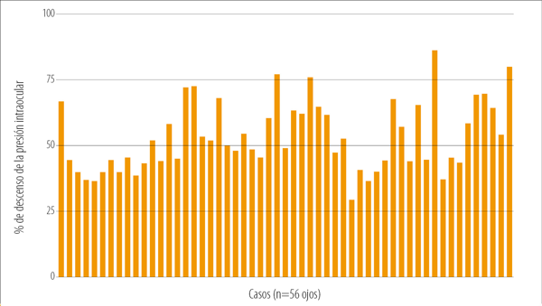 Figura 6. Porcentaje de descenso de la presión intraocular en 56 ojos operados tres meses tras haber sido operados mediante la técnica de trabeculectomía modificada.
