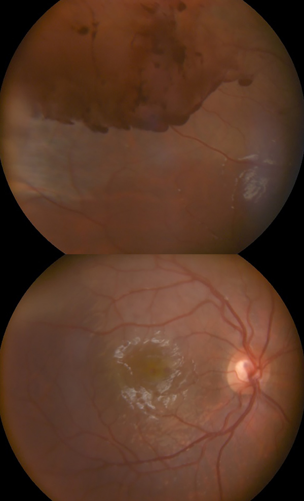 Figura 1. Retinografía donde se observa hemorragia subretinal superior y edema macular.