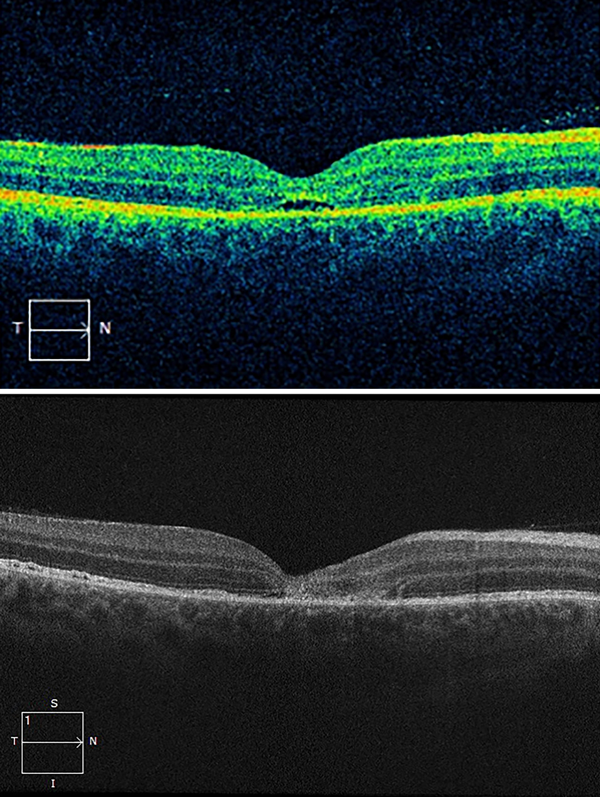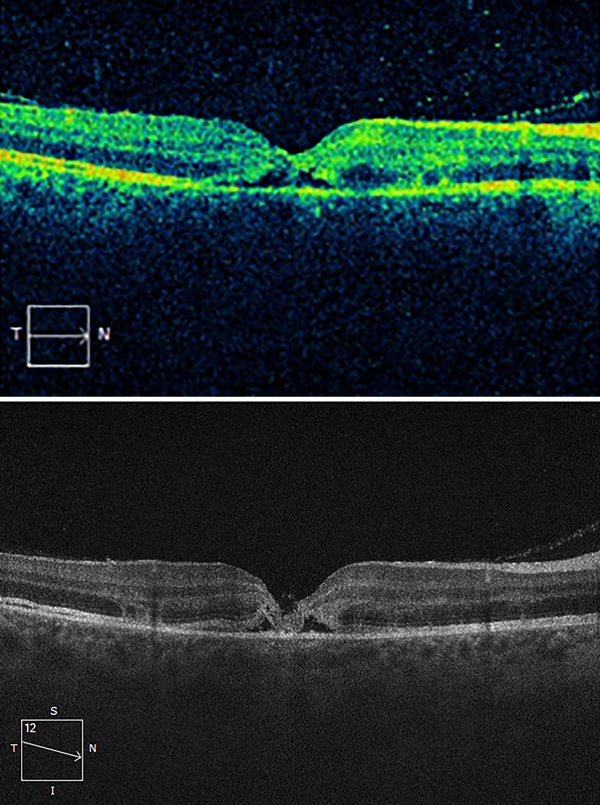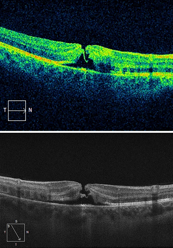 La tomografía de coherencia óptica (OCT) puede desempeñar un papel esencial en el manejo del paciente tanto en la presentación como durante el seguimiento. Las características que podemos encontrar son: pérdida de espesor completo retinal a nivel foveal con una pendiente abrupta entre los bordes escarpados del agujero y el epitelio pigmentario; presencia de opérculo; cambios quísticos retinales, presencia de una membrana epirretinal; y existencia de anormalidades en la retina circundante6.