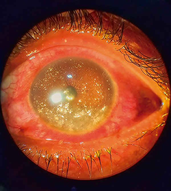 In 1975, Wand et al. explained that cholesterosis bulbi was a condition similar to but different from scintillating synchisis, although in current clinical practice these terms are often used interchangeably1. In the image below, an eye with typical cholesterosis bulbi is shown. This refers to a condition in which cholesterol crystals accumulate in the vitreous and may also pass into the anterior chamber of the eye. This accumulation can occur as a result of trauma or certain underlying ocular conditions, such as Coats disease, retinoblastoma, retinal detachment, retinal vasculopathy, among others. In our case we observed an eye with mixed hyperemia with deposits of iridescent and mobile crystals in the anterior chamber, accompanied by iridocrystalline synechiae. When the patient reaches this stage, he/she usually already has a painful blind eye secondary to glaucoma, which may require a surgical procedure to relieve pain, improve the patient's quality of life, as well as to take preventive measures for the contralateral eye.