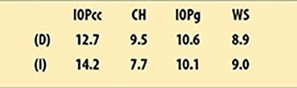 Figure 6. Bilateral ocular response analyzer information. According to the study, ocular pressure measured with the Goldmann tonometer is higher in the right eye. But in the left eye, the corrected intraocular pressure is higher and the corneal hysteresis is lower.