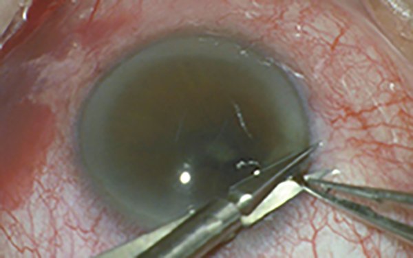 Figure 7. A small-diameter peripheral iridotomy was created to access the retroiridian space using Westcott scissors and a 0.12 mm Castroviejo toothed forceps.