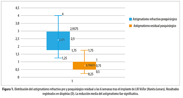 Figura 1. Distribución del astigmatismo refractivo pre y posquirúrgico residual a las 6 semanas tras el implante de LIO VisTor (Hanita Lenses). Resultados registrados en dioptrías (D). La reducción media del astigmatismo fue significativa