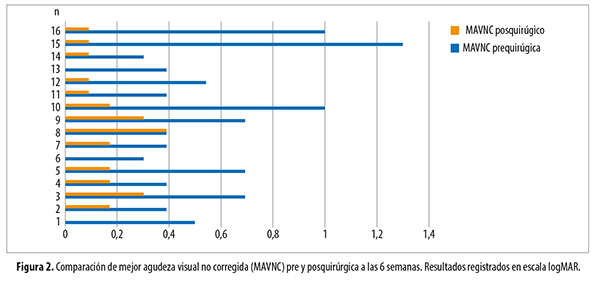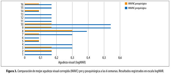 La figura 2 compara las MAVNC pre y posquirúrgicas respectivamente para cada uno de los ojos, con una máxima de AV según logMAR de 1,3 y mínima de 0,3 previo a la cirugía, y una máxima de AV de 0,39 y una mínima de 0 en el postoperatorio. En el grupo postoperatorio, 12 ojos (75%) adquirieron una MAVNC de 0,17 o más (que correspondería a 20/30 del cartel de Snellen) y 14 ojos (87,5%) lograron una MAVNC de 0,30 o más (20/40 según cartel de Snellen).