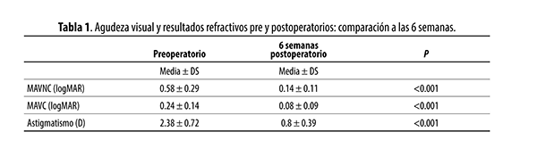 La tabla 1 muestra la media para los valores de MAVNC y MAVC preoperatorio y postoperatorio a las 6 semanas y astigmatismo (cilindro) prequirúrgico y residual. Hubo diferencia estadísticamente significativa entre los valores pre y posquirúrgicos, tanto de la AV como del astigmatismo (p <0,001, test de Wilcoxon para muestras apareadas). Se demostró una reducción media de la MAVNC logMAR de 0,44, una reducción media de MAVC logMAR de 0,16.