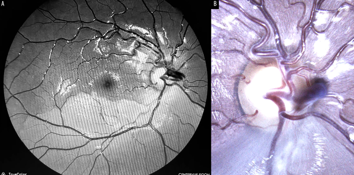 Figura 1. Retinografía. A) AVP arterial y blanqueamiento de la retina temporal inferior con atenuación de los vasos en el territorio comprometido. B) AVP con mayor magnificación y comienzo de blanqueamiento retinal.