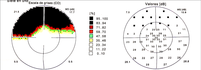 Figura 2. CVC OD. Defecto altitudinal superior incompleto con preservación de la sensibilidad central, correspondiente al compromiso retinal inferior.