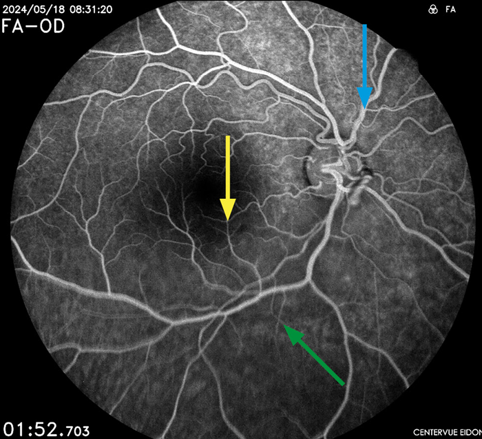 Figura 3. RFG. Fase arteriovenosa. Nótese la AVP torsionada a nivel papilar inferonasal (fecha azul), el retardo en el lleno arteriolar inferior (flecha amarilla) comparado con el superior y las áreas de cierre vascular a nivel inferior (flecha verde).