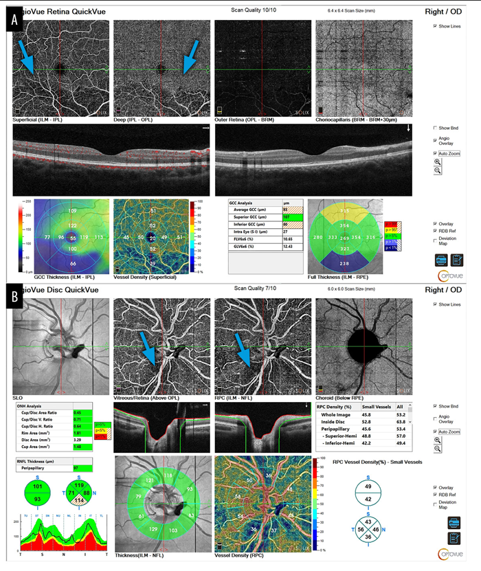Figura 4. Angio-OCT OD. A) Áreas de atenuación del plexo capilar superficial y plexo capilar profundo a nivel de la retina inferior (flechas azules). B) No se observan zonas de cierre vascular a nivel papilar; sí sectores de atenuación a nivel de papila inferior (flecha azul) correspondiente a plexos retinales superficiales y profundos (flechas azules).