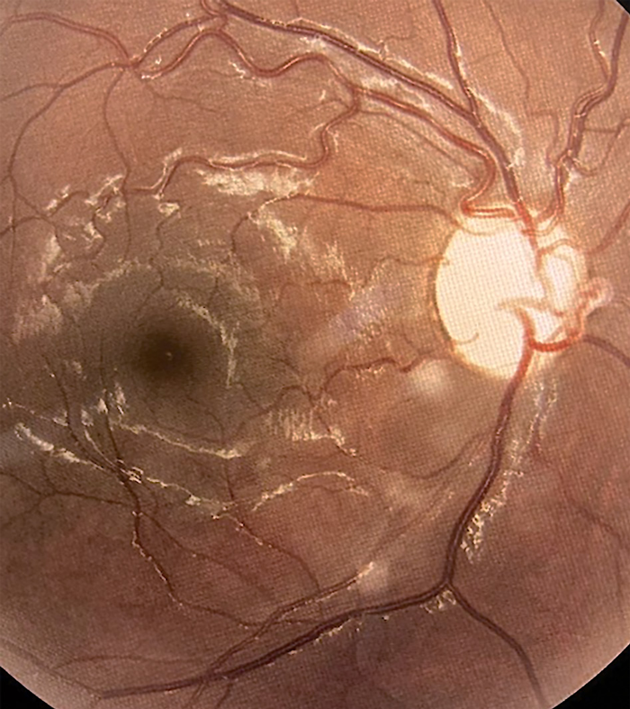 Paciente de sexo masculino, de 10 anos de idade, foi consultado devido a um escotoma visual no olho direito que estava se desenvolvendo há 24 horas. O exame oftalmológico revelou sinal positivo de alça vascular pré-papilar torcida e clareamento da retina temporal inferior com atenuação vascular concomitante.