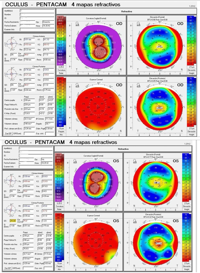 En el estudio del Pentacam de ambos ojos observamos astigmatismo regular en la superficie corneal, con K máxima en OD 72,6D y en OI 76,8D asociado a disminución del espesor corneal generalizada, siendo la paquimetría más fina: de 223 µm en OD y de 225 µm en OI (fig. 3). Ante la presencia de estos hallazgos en conjunto con adelgazamiento escleral asociados al SED se hace diagnóstico de queratoglobo en ambos ojos.