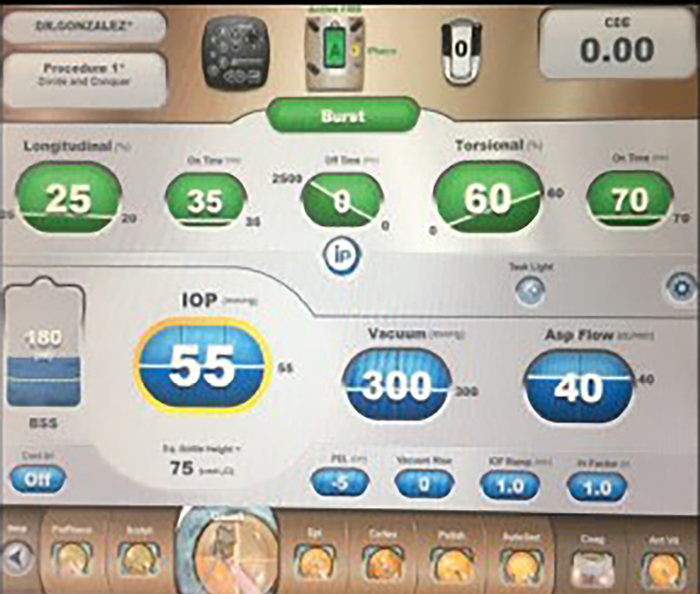 Se realizó un análisis de las variables a estudiar (CDE, duración de la cirugía, fluido utilizado, tiempo de aspiración). Con la información de la interfase del sistema operativo del facoemulsificador (equipo Centurion de Alcon, Fort Worth, Texas, Estados Unidos) que muestra diferentes parámetros quirúrgicos utilizados en cada procedimiento (fig. 1).