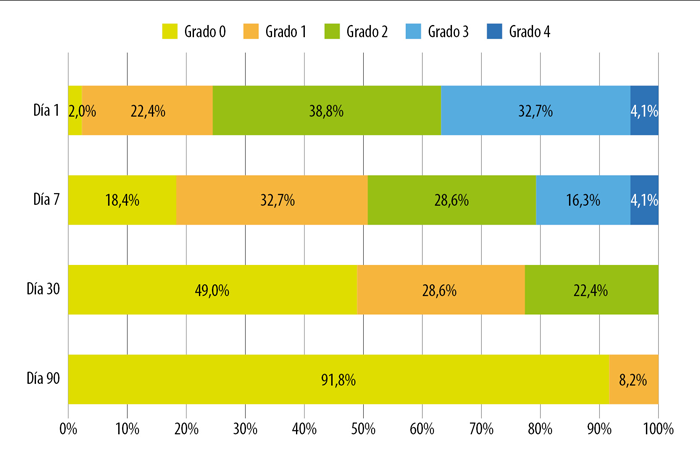 Al evaluar los 49 ojos se observaron cambios estadísticamente significativos con la prueba de Friedman en el grado de edema corneal en el seguimiento del posquirúrgico a los 90 días (p<0,001). Al día 1, solamente 1 paciente (2%) se encontraba en grado 0 de edema corneal, al día 7 del posquirúrgico el número de pacientes en grado 0 aumentó a 9 (18,4%); al día 30 casi la mitad de los pacientes (49%) ya se ubicaba en grado 0 de edema corneal y a los 90 días, casi todos los pacientes (45 de un total de 49) que corresponden al 91,8% se encontraban en grado 0 y los 4 restantes estuvieron en grado 1 de edema corneal (tabla 1 y fig. 2).