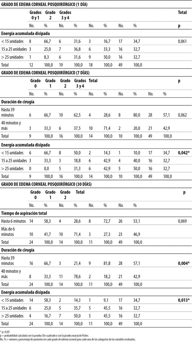 La duración de la cirugía se asoció significativamente con grado corneal a los 30 días. En los pacientes con grado corneal 1, la cirugía de catarata tiende a durar 40 minutos o más en casi el 80% de los casos, mientras que en los pacientes con grado corneal 0 o 2 la cirugía presentó en la mayoría de los pacientes duración de menos de 40 minutos.
