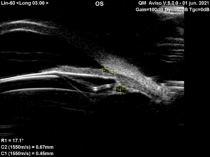 Há casos como o observado na imagem obtida com um UBM (Aviso®, Quantel Medical, Cournon-d’Auvergne, França) durante o controle pós-operatório realizado um mês após o implante, onde foi detectado que a háptica da lente estava “apoiada” em um cisto. Neste caso, pequenos cistos foram detectados em todos os 360° durante o monitoramento pré-operatório. A situação foi então explicada ao paciente e a cirurgia foi realizada, mas decidiu-se utilizar uma lente de tamanho menor do que o recomendado, de acordo com o valor obtido da distância branco-branco na UBM. A lente implantada é uma IPCL tórica e difrativa (Care Group, Índia). O salto obtido foi de 750 micras e o paciente segue estável, sem complicações, com acompanhamento que atualmente dura seis anos.