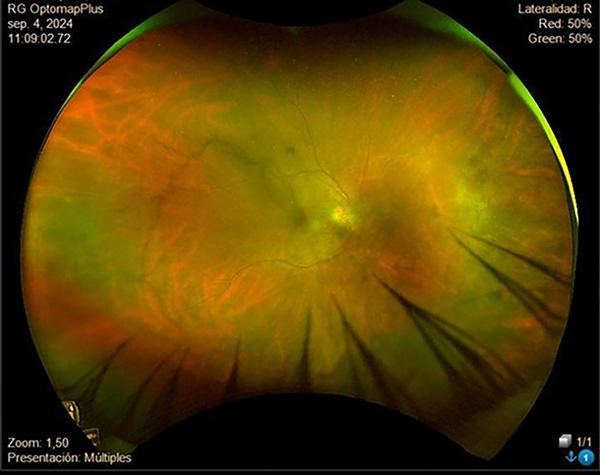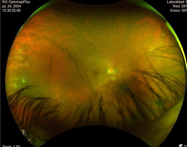 Figura 1. Fundoscopía del ojo derecho bajo tratamiento con valganciclovir vía oral.