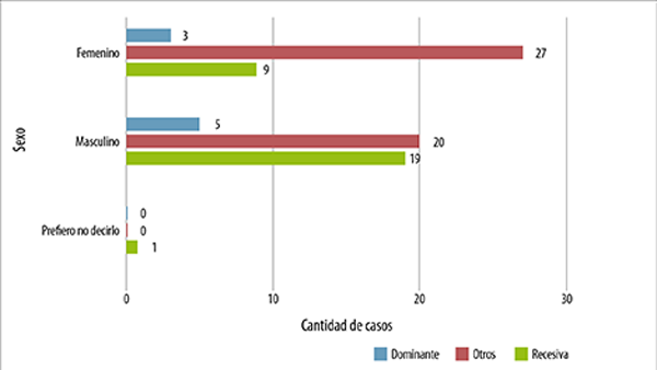 Figura 2. Distribución de casos en relación al sexo y forma hereditaria.