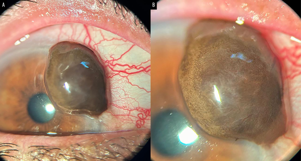 Figura 1. (A) Aspecto biomicroscópico del ojo externo donde resalta una lesión conjuntival pigmentada que sobrepasa el limbo corneal. (B) La lesión con mayor aumento.