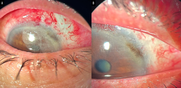 Se envía material para anatomía patológica en formol. Se colocan injertos de membrana amniótica sobre el lecho corneal y una lente de contacto terapéutico.