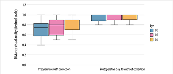 Of the 14 patients included (28 eyes), 10 were women and 4 were men, with a mean age of 71.1 ± 7.3 years (range: 62-86 years). All surgeries were uneventful. Spherical equivalents decreased significantly postoperatively. Preoperative mean values were: OD: +1.7 ± 0.19 D (range: -0.75 to +3.75); OS: +1.5 ± 1.2 D (range: -1.00 to +4.00). At one month postoperatively: OD: +0.17 ± 0.26 D (range: -0.25 to +0.50). OS: +0.08 ± 0.23 D (range: -0.25 to +0.25). Table 1 presents segmented visual acuity data for the OD, OS, and OU, across the different evaluation timepoints.