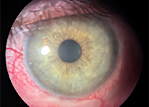 Paciente masculino de 33 años previamente sano consultó al servicio de guardia oftalmológica del Hospital Provincial del Centenario de Rosario por cuadro de quemadura ocular con agua y líquido refrigerante hirviendo del motor de su vehículo de cinco días de evolución. Inicialmente fue evaluado de forma ambulatoria en otra institución con antibióticos y lubricantes. Al examen físico se constató quemadura facial extensa; a la biomicroscopía se observó simbléfaron severo y opacidad corneal total en ojo izquierdo (OI) con isquemia limbar en 180° inferior, sin posibilidad de valorar la cámara anterior o pupila. Dada la severidad del cuadro, se decidió internación en sala general para evaluación sistémica, analgesia, antibioticoterapia y corticoides endovenosos. Se indicó intervención quirúrgica bajo anestesia general con participación conjunta de los servicios de Córnea y Órbita donde se hizo desbridamiento conjuntival, colocación de membrana amniótica y cobertura con lente de Illig para preservar arquitectura (fig. 1).