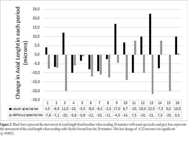 Results: For this study, 16 subjects of both genders (4 females) were tested with Myofix Fresnel lenses. Their mean age was 22.51+/-5.78 years. Their mean spherical equivalent of the right eye was -2.48+/-0.96 diopters. There was a non-significant increase of +1.55 microns in axial length from baseline when reading with the usual prescription (p=0.561). When subjects read in the same situation with Myofix Fresnel defocus spectacles for other 20 minutes, axial length decreased by -8.22 microns (p=0.002).